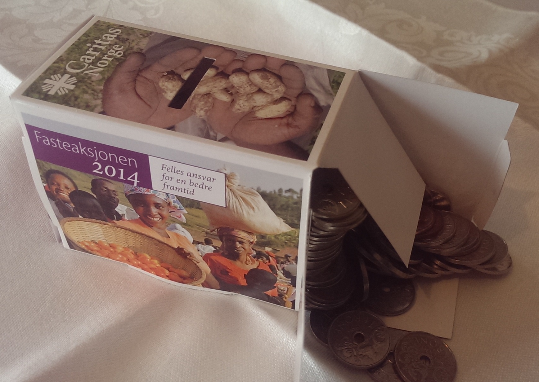 Du kan levere pengene i banken og overføre summen direkte til CARITAS (opplysningene du trenger står på boksen) eller du kan levere den under kirkekaffen på Påskedag.