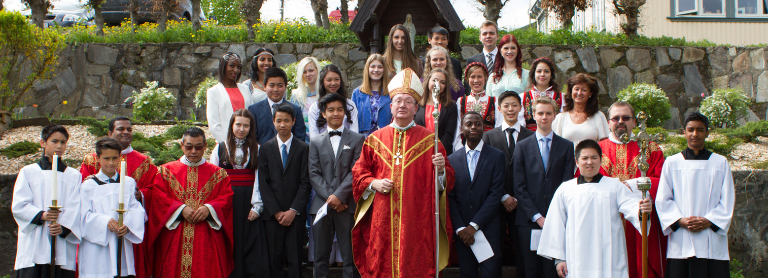 Bildene fra konfirmasjonsmessen er nå tilgjengelig på menighetskontoret. Alle konfirmantene kan hente sitt sett med bilder, et eksemplar av YouCat og attest. På bildet over ser dere biskopen, prester og ministranter, kateketen og de 20 konfirmantene som ble konfirmert i pontifikalmessen 14. mai 2015.