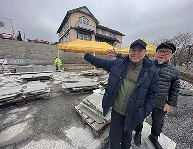 Pater Joseph og arkitekt Twin V. Nguyen viser stolt frem det ferdigmurte fundamentet til tabernakelet i Mariahagen. (foto: C.B.Astrup)