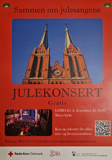 Samarbeidsrådet for Tros-og Livssynssamfunn, (STL) avd. Grenland, der også vår menighet deltar, inviterer til STLs største fellessarrangement noensinne: Gratis julekonsert i Skien kirke, der kor og orkestere fra ulike tros-og livssynssamfunn deltar. Merk deg tidspunktet, lørdag 2. desember kl. 18:00.