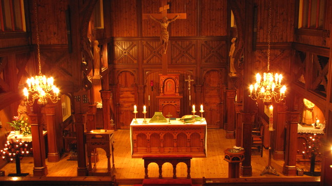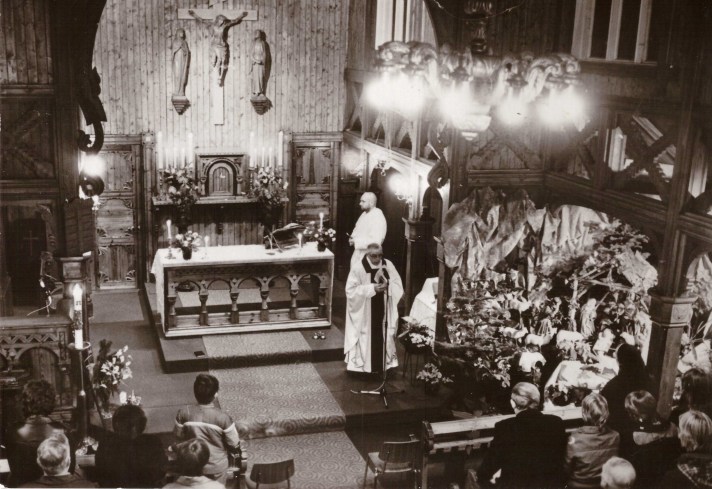 Bildet er trolig en gang på 60-tallet. Pater Rommelse celebrerer assistert av Kåre Hagen.