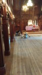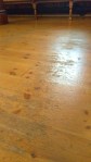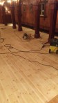 En ivrig arbeidsgjeng har jobbet fra idag tidlig til sent på kveld for å slipe gulvet i kirken. I lang tid har det vært store skader på gulvet og nå (etter mange timers hardt arbeide) er den gamle lakken slipt av og skadene er reparert. Alt er klart for første strøk med lakk. Til og med lørdag ettermiddag er kirken stengt.