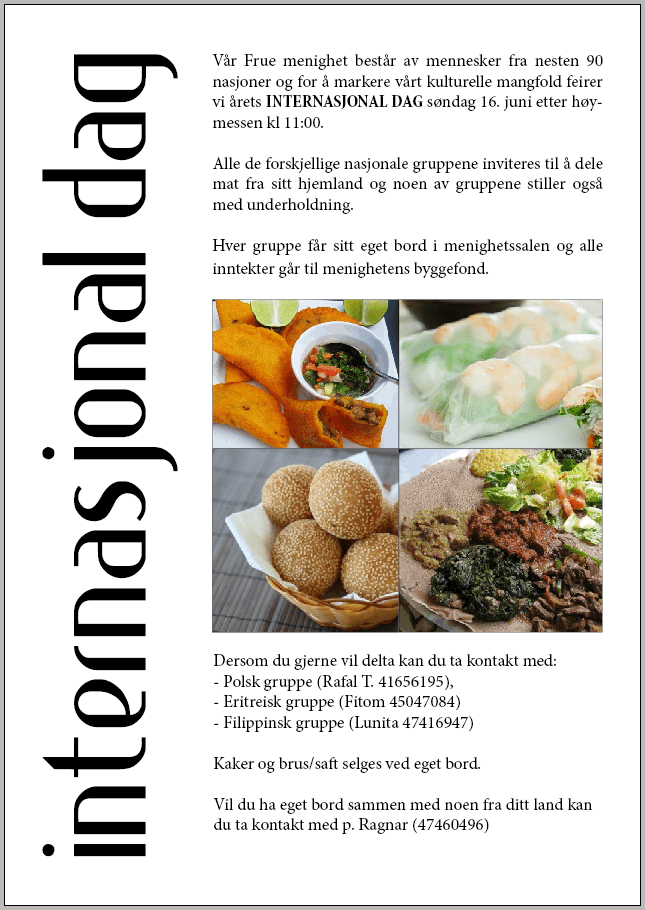Lørdag 22. april er det dugnad i Vår Frue Menighet og vi håper at så mange som mulig kan stille opp. Vi starter kl 10:00 og den filippinske gruppen sørger for varm lunsj til alle som deltar. Tidligere år har vi vært ferdige før kl 15:00.