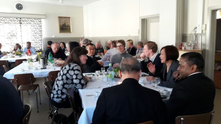 Det var menighetsrådet som var vertskap og det var dekket til over seksti frivillige i menighetssalen lørdag formiddag. De forskjellige gruppene bidro med matretter fra sine hjemland og biskopen satte av tid til å snakke med alle som var tilstede.